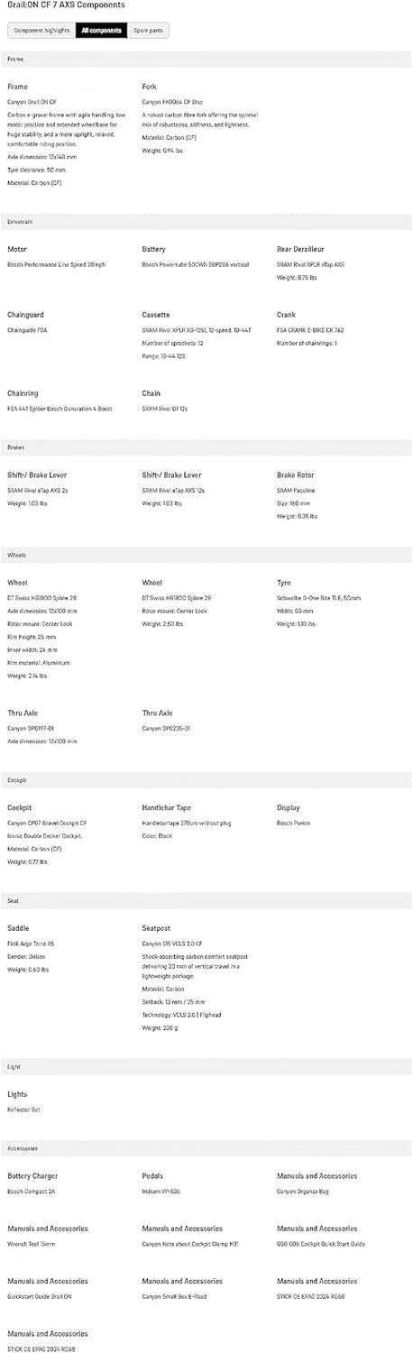 Break boundaries. Go further. The Grail:ON CF 7 AXS is the gravel bike reimagined with electric power, offering you the freedom to explore at your own pace. Designed to handle the toughest gravel and off-road adventures, this bike brings together cutting-edge carbon engineering with a powerful Bosch Performance Line CX motor, offering 85Nm of torque and a 500Wh battery for unlimited adventure. Whether you're tackling long-distance gravel rides, technical trails, or high-speed descents, the Grail:ON CF 7 AXS delivers the performance, comfort, and versatility you need to go the distance. Why choose Canyon? Canyon bikes are engineered with precision, designed for riders who demand the best. Built in Germany, every Canyon bike benefits from the expert craftsmanship, innovative technology, and rigorous testing that set us apart. With a commitment to superior quality and exceptional performance, Canyon bikes deliver an uncompromising ride experience. Find your perfect fit The Grail:ON CF 7 AXS comes in a range of sizes to ensure you get the perfect fit: S – 27.5 wheel | 172-178 cm (5'7"-5'10") M – 700c wheel | 178-184 cm (5'10"-6'0") L – 700c wheel | 184-189 cm (6'0"-6'3") XL – 700c wheel | 189-194 cm (6'3"-6'4") Warranty & Risk-Free Shipping 6-year Canyon warranty – Built to last, backed by Canyon's exceptional support. 30-day return policy – Ride it, love it, or send it back with no hassle. Easy assembly – The bike arrives in our specially designed Bike Guard box, 95% pre-assembled with all the tools you need for a quick setup. Take your gravel riding to the next level with the Grail:ON CF 7 AXS – the electric gravel bike that combines performance, comfort, and the power to go the distance.