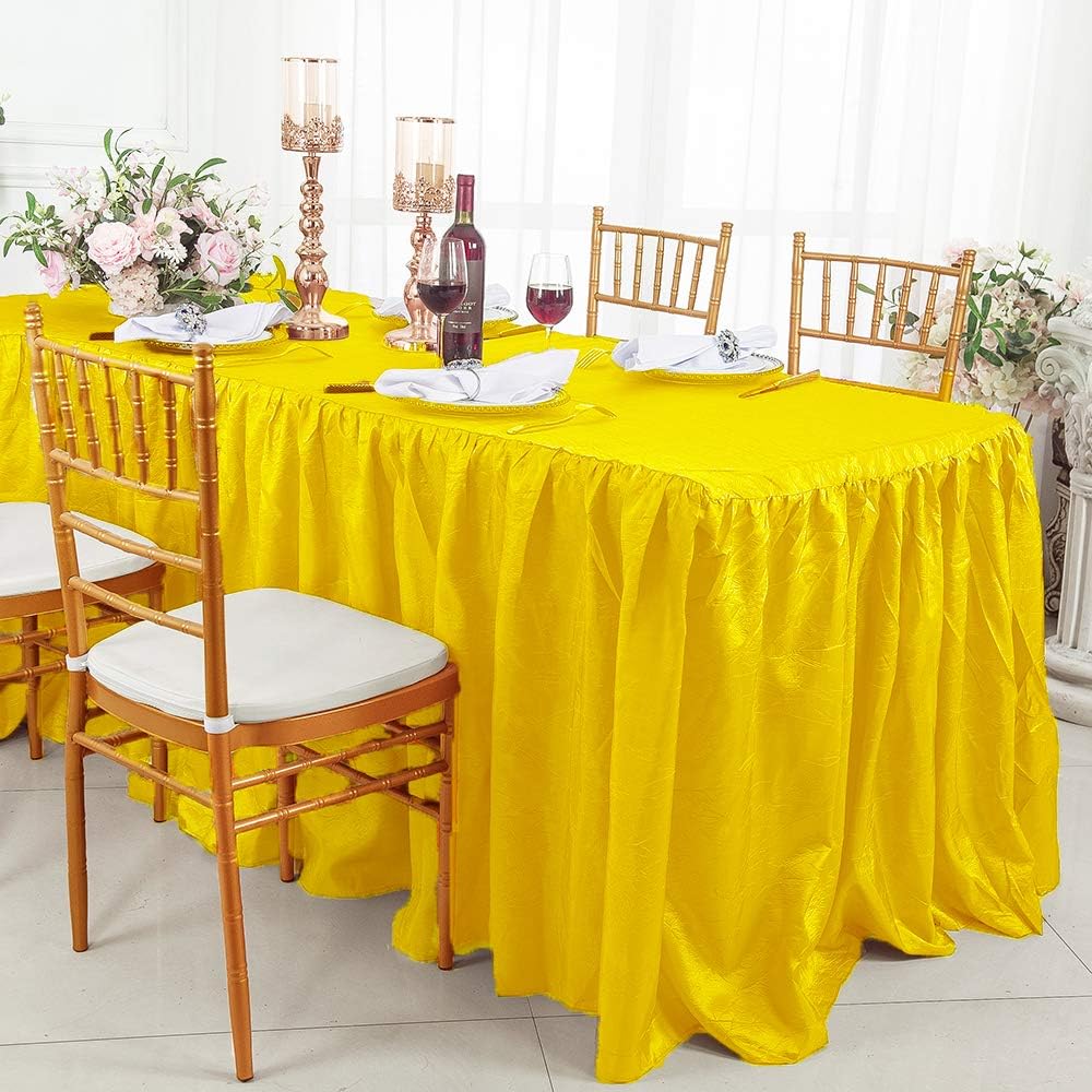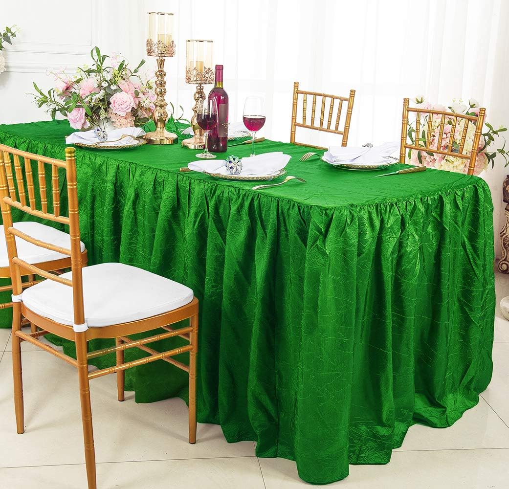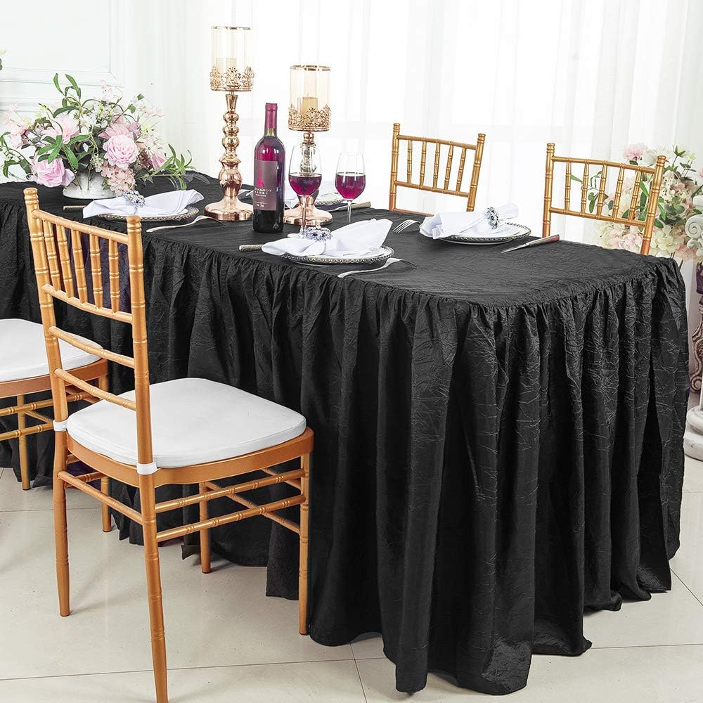 Wholesale brand new, high quality Rectangular Banquet Crushed fitted Taffeta table cover with table skirt now comes in one piece and one price. Crinkle taffeta ruffle tablecloth skirt requires NO table clips = decoration simplified! Table cover is easily laundered, and NO ironing needed. Our Crushed Crinkle Taffeta table linens with table skirts are made from high quality taffeta material with a beautifully ruffle and hemmed edge, giving them a delicate yet elegant appearance to the overall look of the table. Our rectangular crushed crinkle taffeta tablecloths with skirt are perfect for weddings, trade shows, and corporate events.