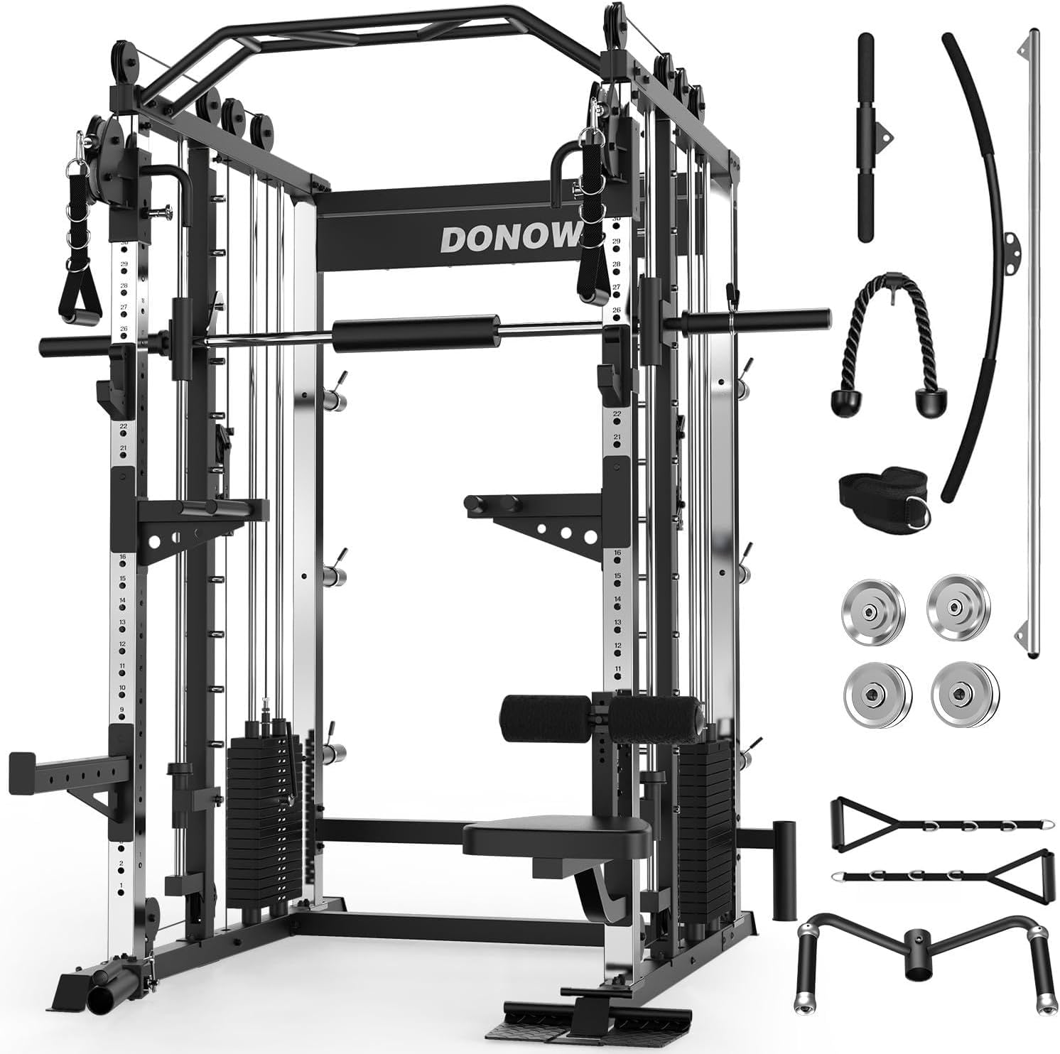 | Included Components | Smith Machine, Weigh Stacks, Lat Pull Down Bench, Landmine, Dip Handles, Lat Pulldown Bar, Straight Bar, T-Bar, Tricep Rope, Ankle Strap, Stirrup Handles |