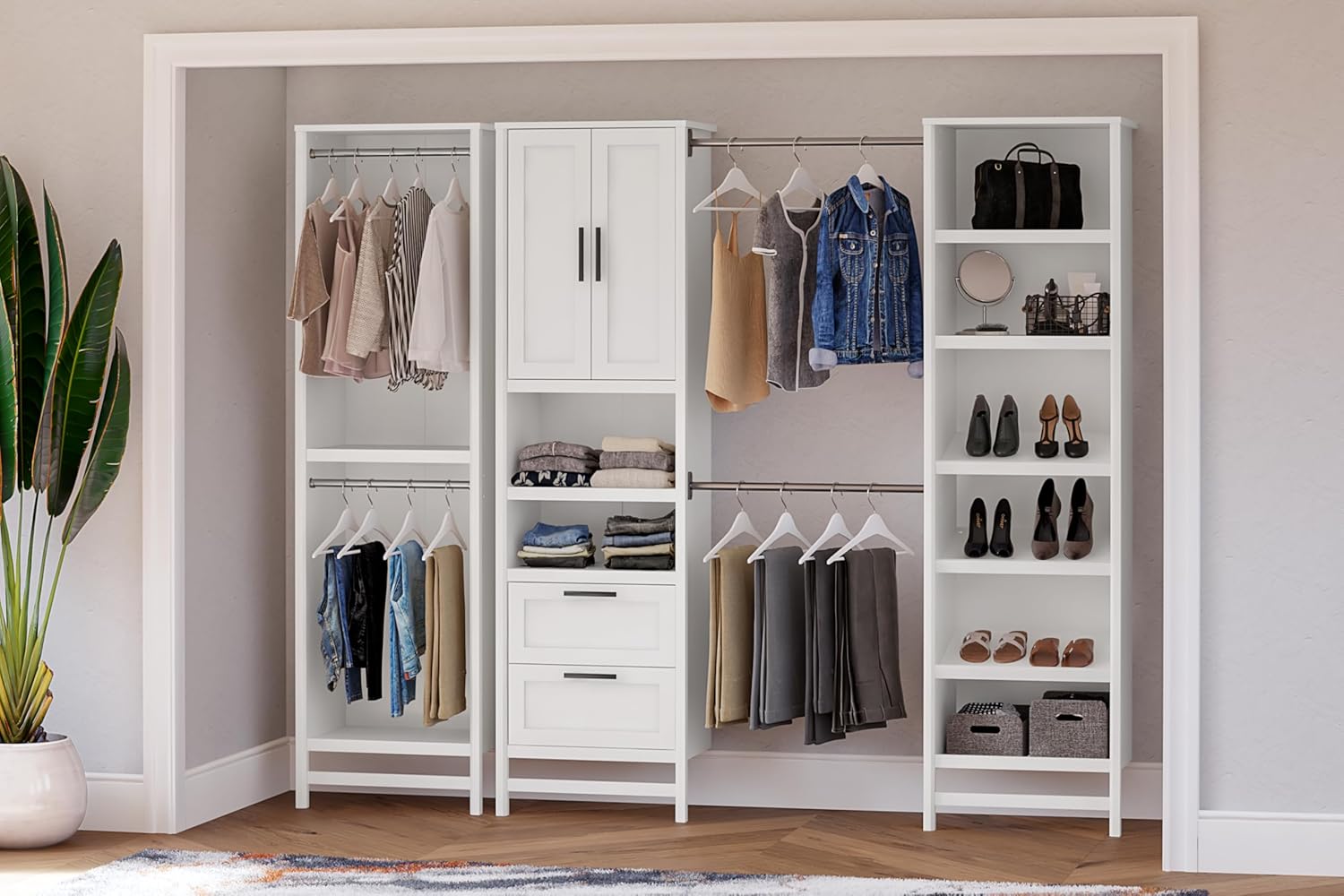 Let us take the guesswork out of your closet organization project with the Luxe Closet Collection by Systembuild Evolution. Crafted from durable MDF and engineered wood, each piece combines luxury and practicality. (Each unit sold separately) Fully finished backs, 5-piece framed drawers, and meticulous details enhance the collection's elegance. Luxe 2-Shelf Double Clothing Rod Closet Tower is a standout, offering two wide shelves and two built-in clothing rods.